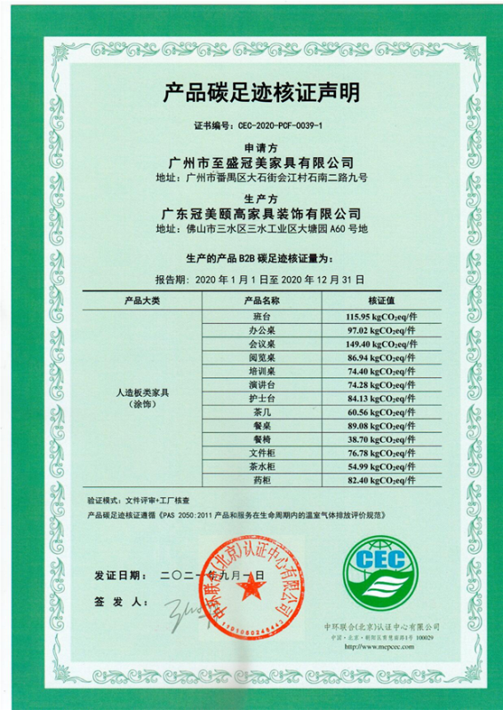 廣東冠美頤高家具裝飾有限公司碳足跡證書-CEC-2021-PCF-0039-1-人造板類家具(涂飾)