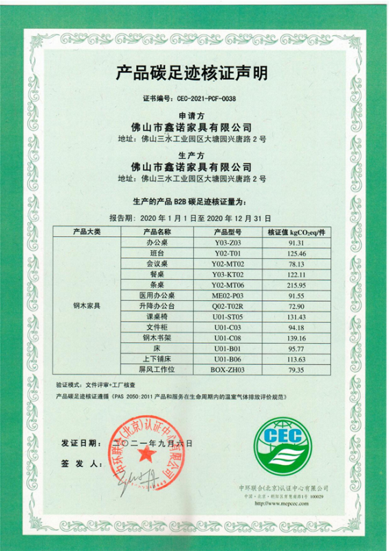 上一篇:佛山市鑫諾家具有限公司碳足跡證書-CEC-2021-PCF-0038-金屬家具