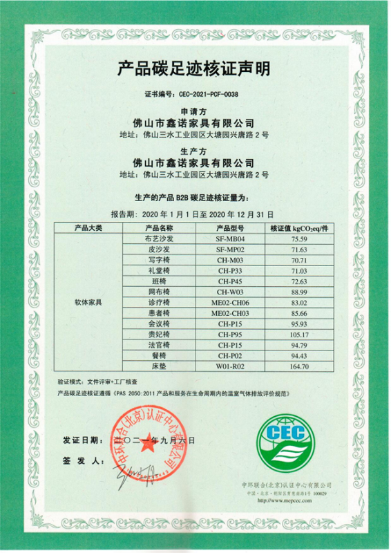 佛山市鑫諾家具有限公司碳足跡證書-CEC-2021-PCF-0038-軟體家具
