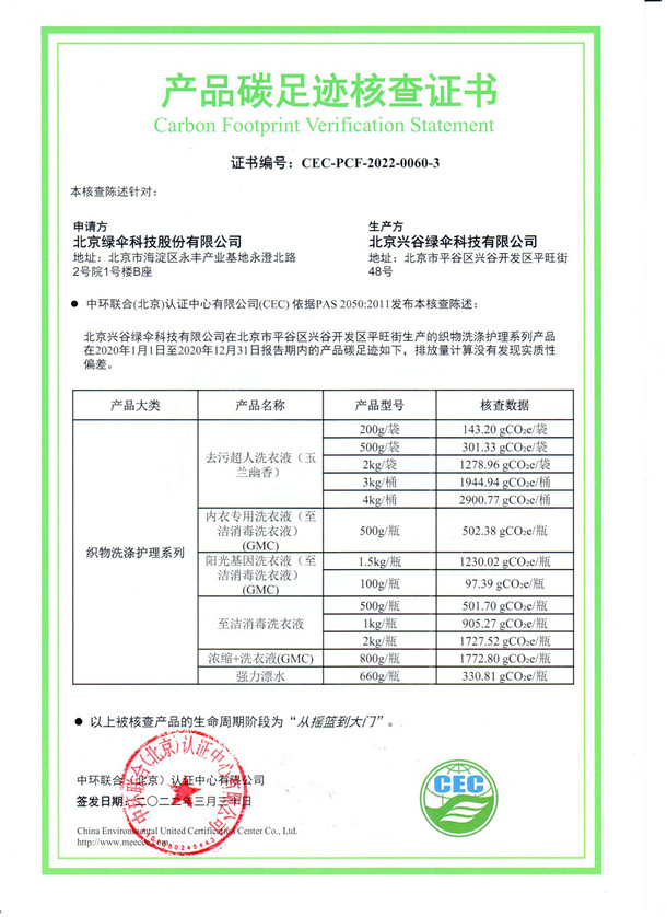 北京興谷綠傘科技有限公司-CEC-PCF-2022-0060-3-織物洗滌護理系列