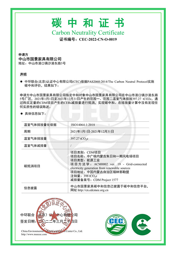中山市國景家具有限公司碳中和證書-CEC-2022-CN-O-0019