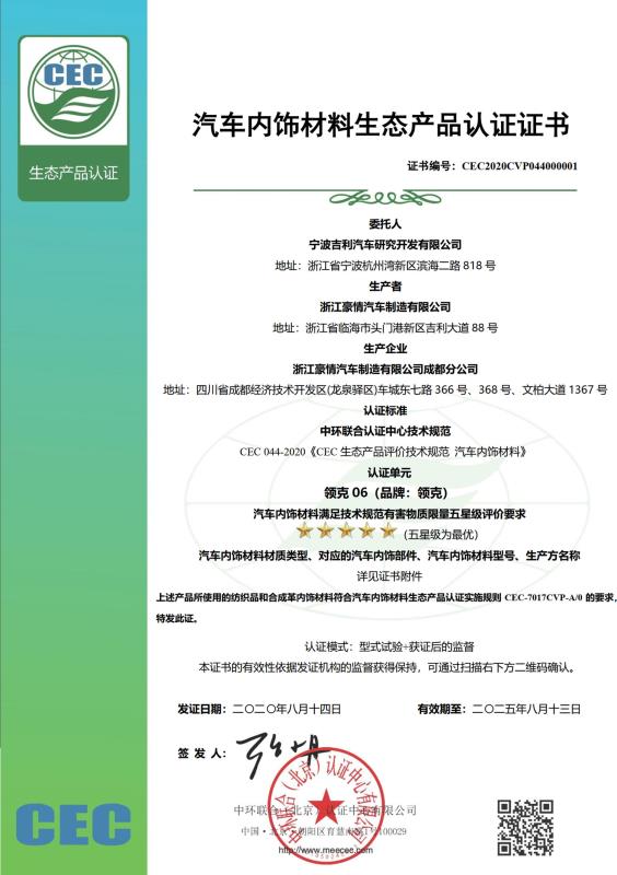2020年8月14日,中環聯合向寧波吉利汽車研究開發有限公司簽發了首張“汽車內飾材料生態產品認證證書”,吉利生產的“領克06”車型所使用的紡織品和合成革類內飾材料經評價滿足技術規范有害物質限量五星級的要求。