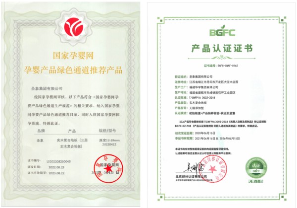 圣象集團(tuán)及所屬工廠(chǎng)先后通過(guò)FSC森林認(rèn)證、ISO9001質(zhì)量管理體系、ISO14001環(huán)境管理體系、職業(yè)健康安全管理體系的認(rèn)證,圣象產(chǎn)品獲得國(guó)家孕嬰網(wǎng)孕嬰產(chǎn)品綠色通道推薦產(chǎn)品、環(huán)境標(biāo)志認(rèn)證產(chǎn)品、綠色產(chǎn)品、綠色無(wú)醛添加型等證書(shū)。
