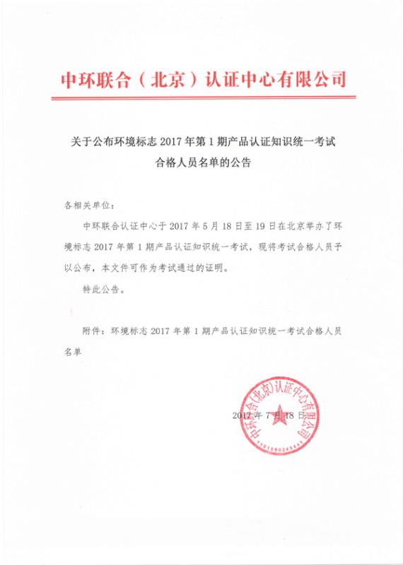 環境標志2017年第1期產品認證知識統一考試合格人員名單