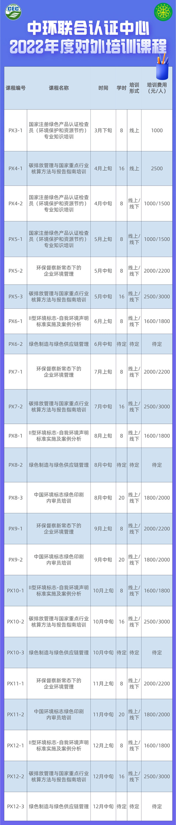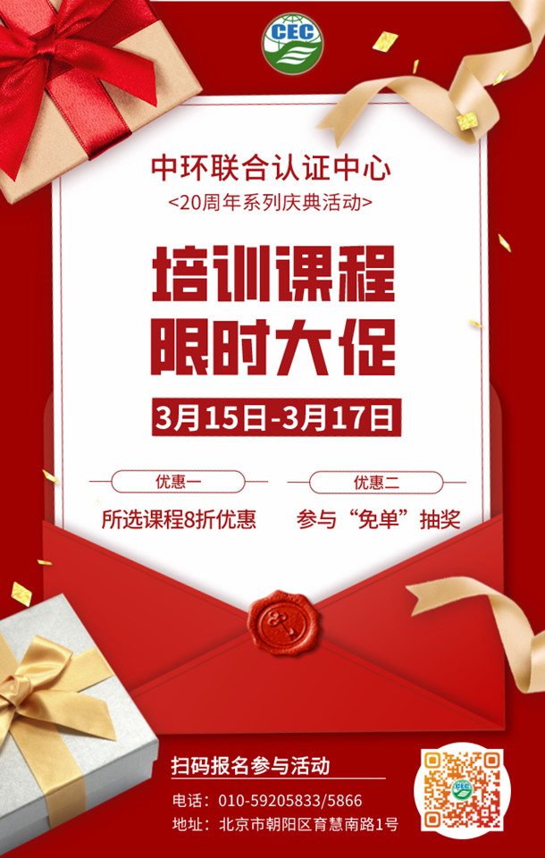 2022年中環聯合認證中心將迎來20周歲。二十年來,中環聯合始終致力于為國家生態文明建設服務,積極開展環保節能低碳發展策略和解決方案研究,不斷完善和創新綠色產業評價體系,服務于行業綠色發展轉型。通過獨立、公正、高質量的評價與認證,服務于政府、企業及公眾,為其搭建綠色生產與消費溝通的橋梁。為回饋長期支持和幫助中環聯合的社會各界朋友和廣大客戶,中環聯合認證中心特推出系列培訓課程優惠活動。